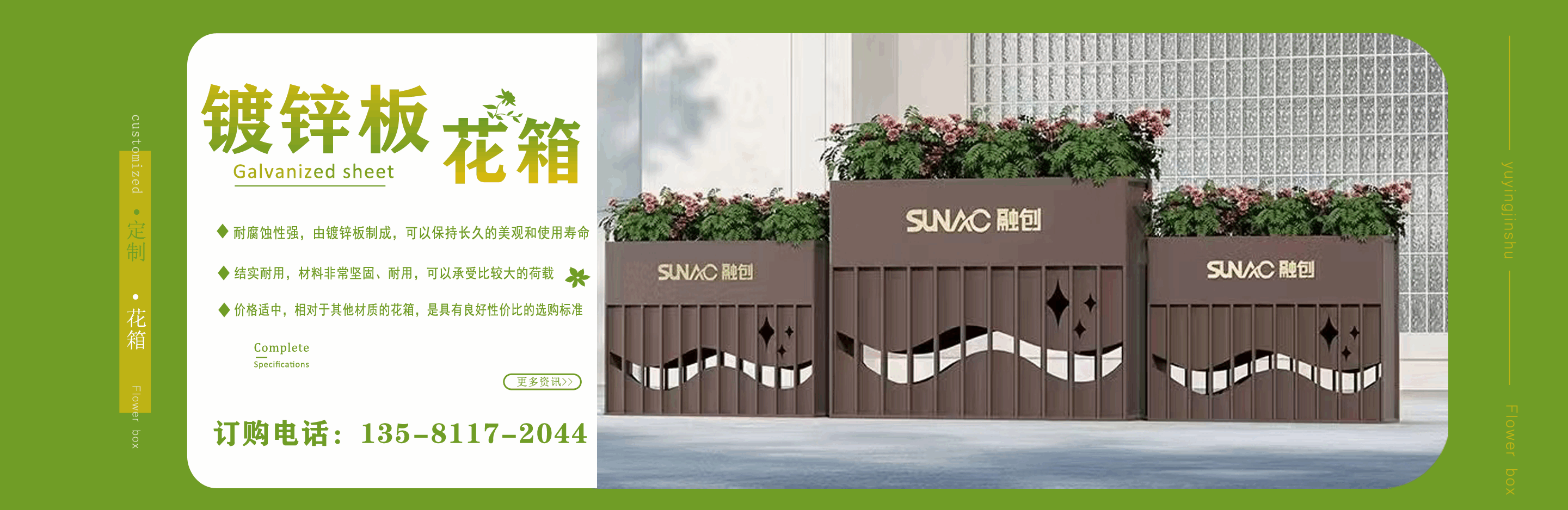 山東鈺盈金屬制品有限公司主營鍍鋅板花箱,道路隔斷花箱,定制花箱,戶外道路花箱,花箱座椅等產品,產品結構合理、性能優良,具有強度高、耐腐蝕、抗老化、隔熱隔音、節約能源、外形美觀、使用壽命長等優點,深受國內外客戶認可。  我們根據客戶所在城市的文化特征,制造出符合當地城市文化氣息的自然立體、觀賞性強的花箱產品成為城市里一道靚麗的風景線。  公司實行誠實、公正、守信、價格合理、平等互利。  公司憑借雄厚經驗實力,恪守誠信為本的原則,得到了眾多客戶的信賴,并在業界獲得良好的口碑。建立了穩固的合作關系,隨著業務的不斷發展和壯大,合作伙伴的范圍也在不斷擴大。我們熱情盼望與您的合作,為社會的可持續發展獻上一份努力。...
